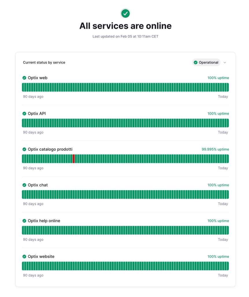 La tua operatività è la nostra priorità. Per questo mettiamo a tua disposizione una dashboard pubblica e sempre accessibile, dove puoi verificare in ogni momento e in tempo reale lo stato dei nostri sistemi.